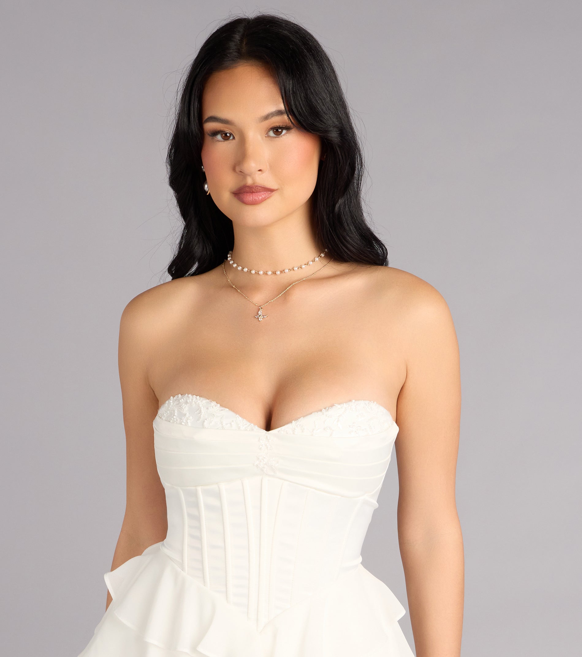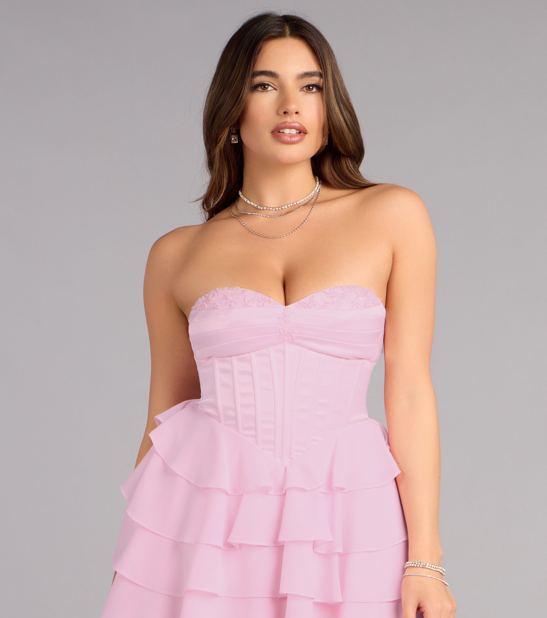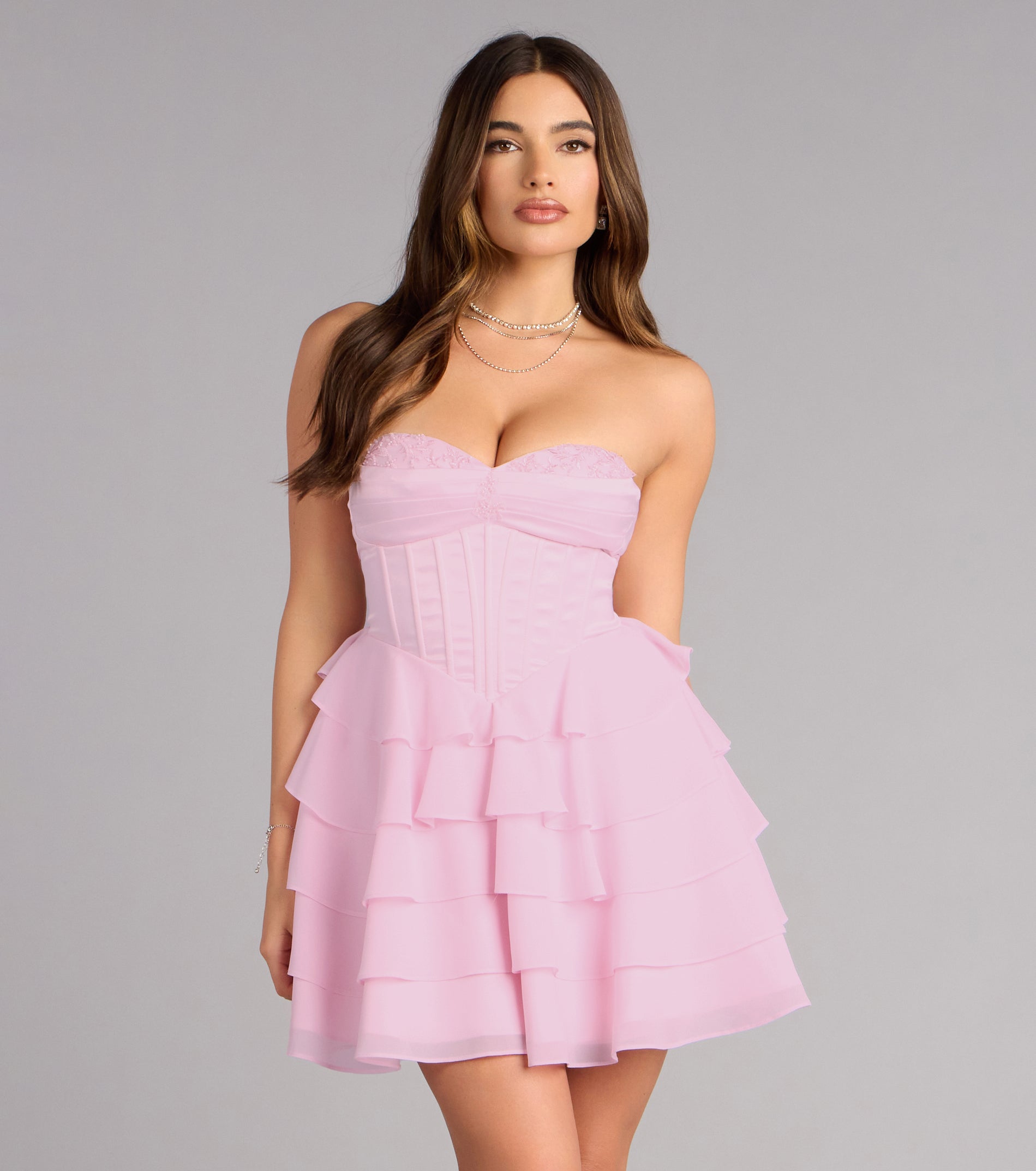 Playful yet impeccably polished, the Jade dress is designed for celebrations that call for charm with a fashion-forward twist. Featuring a satin strapless corset bodice with beaded applique neckline trim, this chiffon tiered ruffled mini-length silhouette brings movement, structure, and a touch of romance to every entrance.