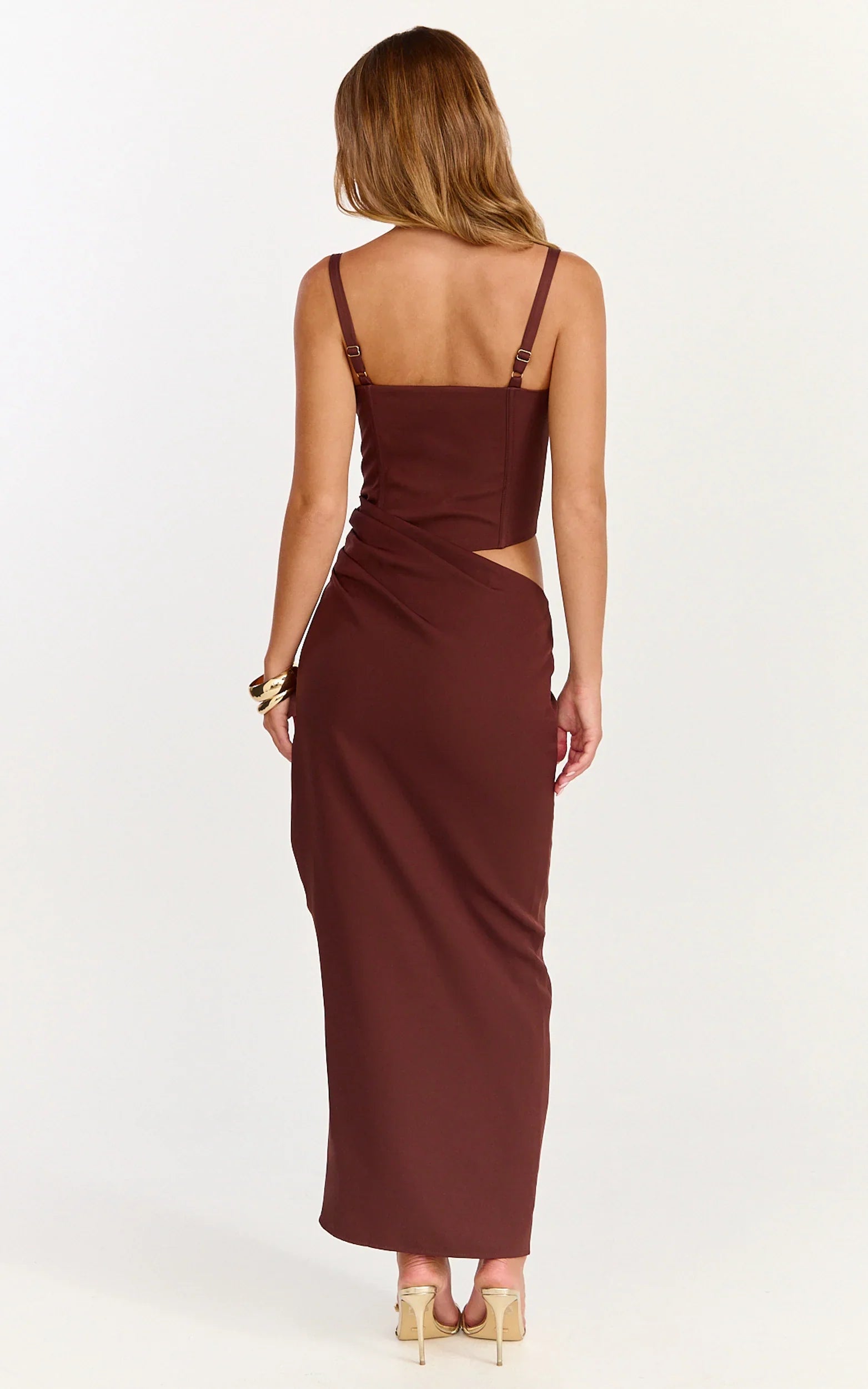 Un corpiño de corsé esculpido se combina con una cintura drapeada y una falda maxi fluida para una silueta que define, alisa y se desliza. El rico tono chocolate es una actualización chic y sin esfuerzo para tu línea de vestidos de ocasión, exuberante, atemporal y muy favorecedor para todos los tonos de piel.