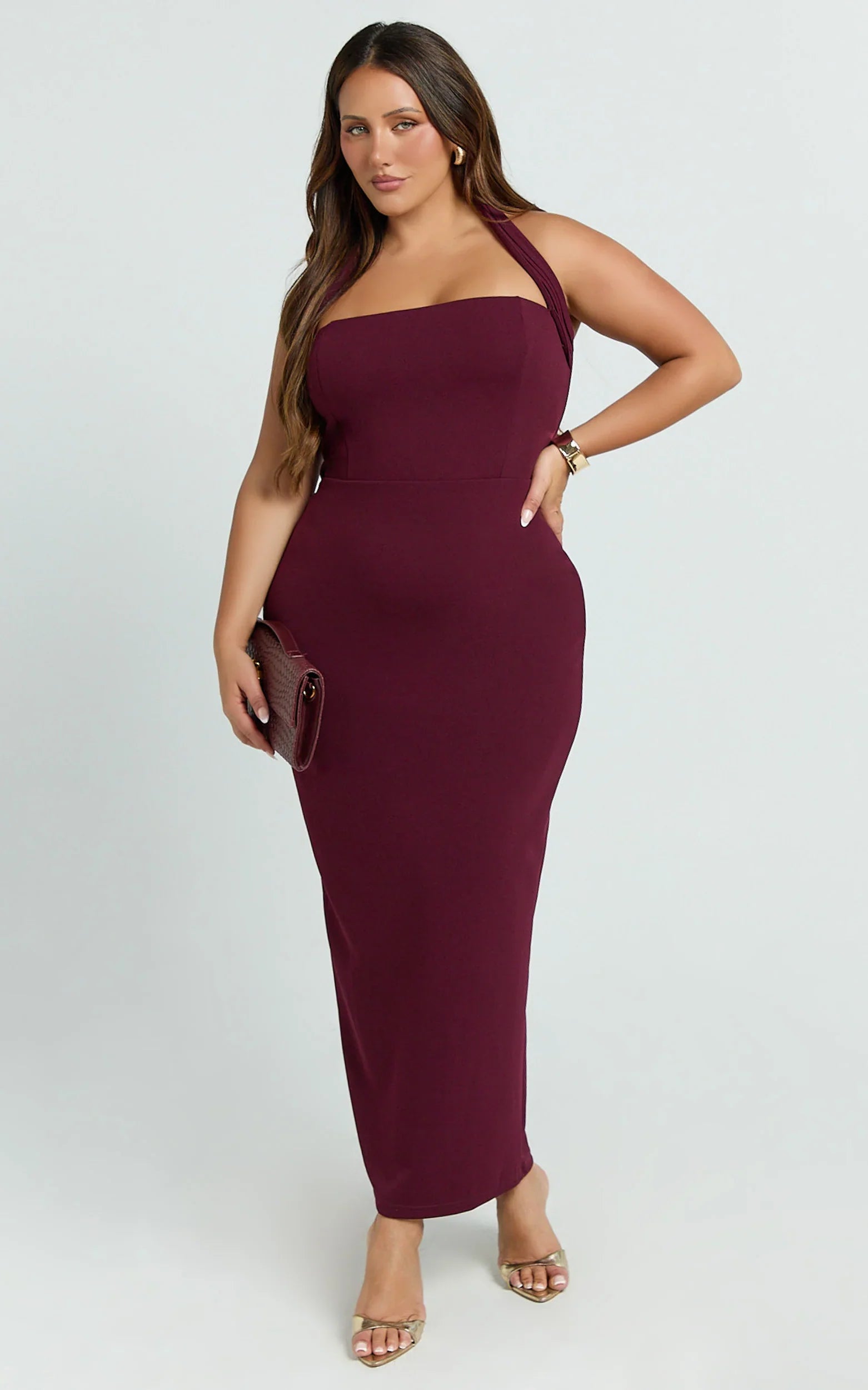 The Salome Midi Dress in Wine sculpts and elongates with its halter-neck column silhouette, serving sleek, night-out elegance with a body-skimming fit and flattering open back. It’s a refined take on event dressing, clean, modern, and made for every RSVP on your calendar, from romantic dinners to wedding guest moments. Styling is simple and intentional: pair with gold jewellery and barely-there heels to let the silhouette shine, then finish with a compact clutch for that polished edge. Minimal effort, maximum impact, this wine midi is ready to be the new hero of your going-out rotation.